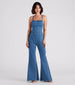 Elevate your style to major-trendsetter status! This denim jumpsuit is perfect for being seen around town. It features a sleeveless square neckline with halter straps. an open lace-up back with tie closure. front pockets. and a hip-hugging fit with a flared hem. Complete the look with an edgy choker.