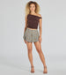 Keep it poised in a mini skirt with a mid-rise waist. plaid pattern. and flattering pleats. Complete with an off-the-shoulder top and flats.Â