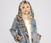 Give your look a sassy vibe by layering on this faux fur denim jacket! It features a trendy leopard printed faux fur hood and lining. Pair with a basic mini dress and some chunky sneakers for an adorable everyday outfit.
