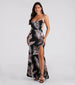 You'll be ready for those relaxing beachside strolls in this gorgeous tropical print maxi dress. It features a sleeveless V-neckline. spaghetti straps. an alluring backless design. a flowy. floor-length hem. and a thigh-high front slit. The smooth knit fabric showcases a tropical palm leaf print. Style with slip-on sandals.