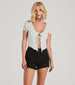 Let this flirty crop top sweep you somewhere sweet! Boasting short sleeves. a V-neckline. and dual tie-front accents. this top flaunts your cuteness with a center slit and a cropped length. Complete the look in cute denim shorts for any casual plans.