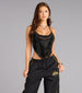 Turn the lights down and glam up. This rhinestone halter top shines with a draped cowl neckline and open back tie—made for statement nights. dance floors. and unapologetically bold moments.