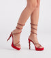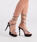 These eye-catching stiletto heels will add a spark of glamour to your night-out look! They feature an open almond toe with dual asymmetric straps. a platform sole. a tall stiletto heel. and a spiral strap design that starts at the heel and wraps around the leg. The straps feature mini rhinestone embellishments for a stunning shine. Style with a sleek faux leather clutch.