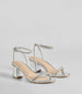 Dress up for the party in these sparkly metallic block heels featuring rhinestone embellished straps and a sleek round toe. Perfect for styling with a party dress.