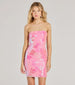 You'll be a sparkling cutie in this bodycon mini dress crafted with an iridescent sequin embellished mesh fabric that shimmers and highlights your shine at parties and events. The short dress features a strapless straight-across neckline and a bodycon silhouette.