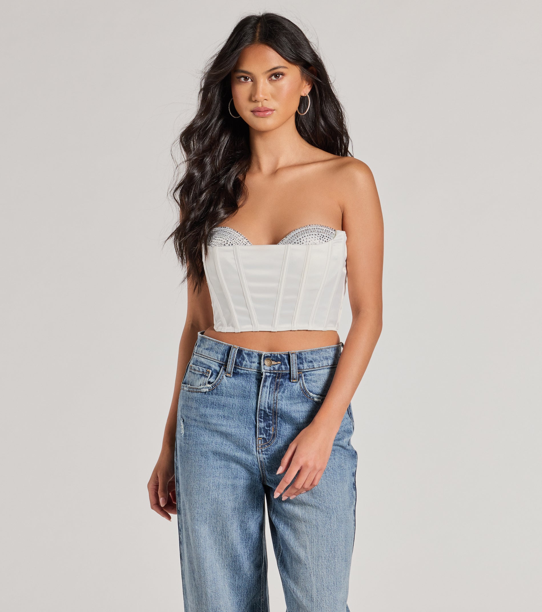 Sparkle at night in this rhinestone satin corset with a luxe layered charm everyone will adore! Pair with denim jeans.
