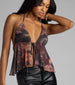 For when your outfit's louder than your group chat. This abstract print mesh halter top is light. effortless. and made for catching stares you weren't even trying for.