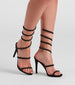 Catch all eyes on you in these stiletto heels that bring major glam! The high heels feature an almond toe. a thin toe strap. and a spiral ankle design with rhinestone embellishments. Complete the look with a chic clutch and jewelry.