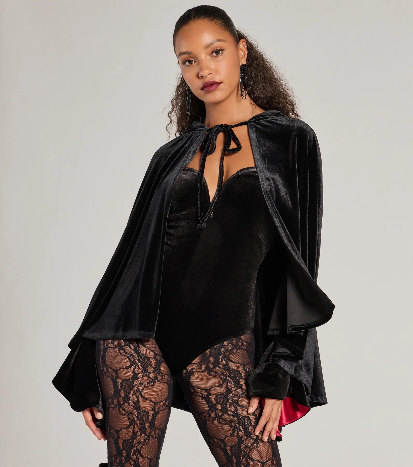 Create a spooky and sultry Halloween costume with this velvet cape! It features a hooded neckline with a tie-front closure. an open-front design. and a flowy silhouette. Complete your look with a bodysuit. sheer tights. and sleek boots!