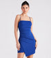 Serve up a spoonful of your sultry self in this crepe mini dress perfect for a girl's night! It features a sleeveless square neck. spaghetti straps. a bodycon fit. and a faux wrap front on stretchy crepe fabric. Complete the look in rhinestone stiletto heels.