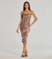 Get spotted in a chic midi dress that features a trendy leopard print. a sleeveless sweetheart neckline with lace trim. a mini bow accent at the bust. sleek bungee spaghetti straps. and a midi length hem accented with a center slit at the back of hem. Complete date night outfit with block heels.
