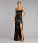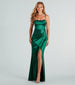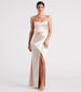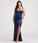 Stunning from every angle! Serve pure elegance in the Stacie satin formal dress - a sultry option for bridesmaids. dressy cocktail parties. and celebrations. It features a sleeveless sweetheart neckline with a pretty cowl draping. adjustable spaghetti straps. a padded bust. and a corset bodice with flexible boning. The side pleated seam creates the asymmetrical form-hugging silhouette with a wrap-long hem and slit design. The formal dress is composed of a silky soft satin-lined fabric with a moderate stretch.