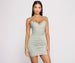 It's time to refresh your wardrobe with this adorable mini dress! It features spaghetti straps. a ruffled V neckline. center ruching. and a short. curve-hugging fit. The lined knit fabric offers plenty of stretch for comfortable wear. Accessorize your look with cat-eye sunglasses and heeled mules.