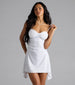 Get ready to make a statement in this glitter mini dress! The fitted bodice hugs your curves for a flattering and confident look. while the uneven mini-length hem adds a touch of edge.