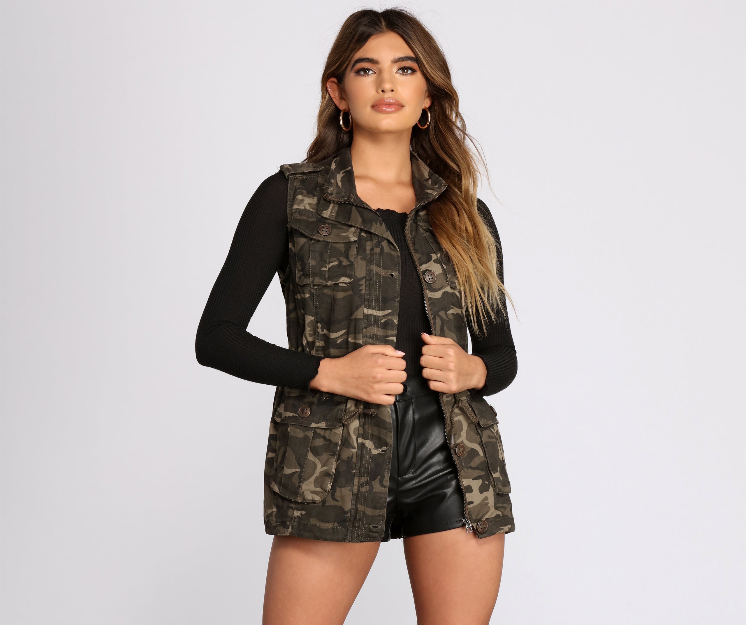 Girl. we love the way you sneak camo into your OOTD! Look stealthy and stylish in this trendy vest. Style it up with a pair of high waisted shorts and a long sleeve tee!