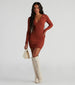 Step up your everyday fall 'fits with this trendy mini sweater dress. It features a johnny collar. a V-neckline with a partial button-down front. long fitted sleeves. and a short. form-hugging silhouette. The ribbed knit fabric offers a moderate stretch. Style with sleek hoop earrings and knee-high boots.