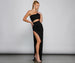 Sleek and sexy. the Stephanie formal dress will have all eyes on you. She features an asymmetrical one-shoulder neckline with a single short cap sleeve. a chic waist cutout. and a fitted floor-length silhouette with a sultry thigh-high side slit. Style this dress with hoop earrings and clear heels.