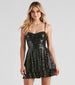 You in this stunning sequin skater dress will stop them in their tracks! The dress features a sleeveless sweetheart neckline. a bustier-style bodice with a padded bust. adjustable spaghetti straps for a customized fit. a high waist seam. a flirty short skater skirt with a tiered design. and a fab fit and flare silhouette. The lined mesh fabric features all-over sequin embroidery. Complete the look with strappy stilettos.