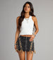 This isn't your regular denim skort. Designed with lace-up sides and raw edge details. it's equal parts effortless and unapologetic. Wear it when you want your outfit to do the talking.