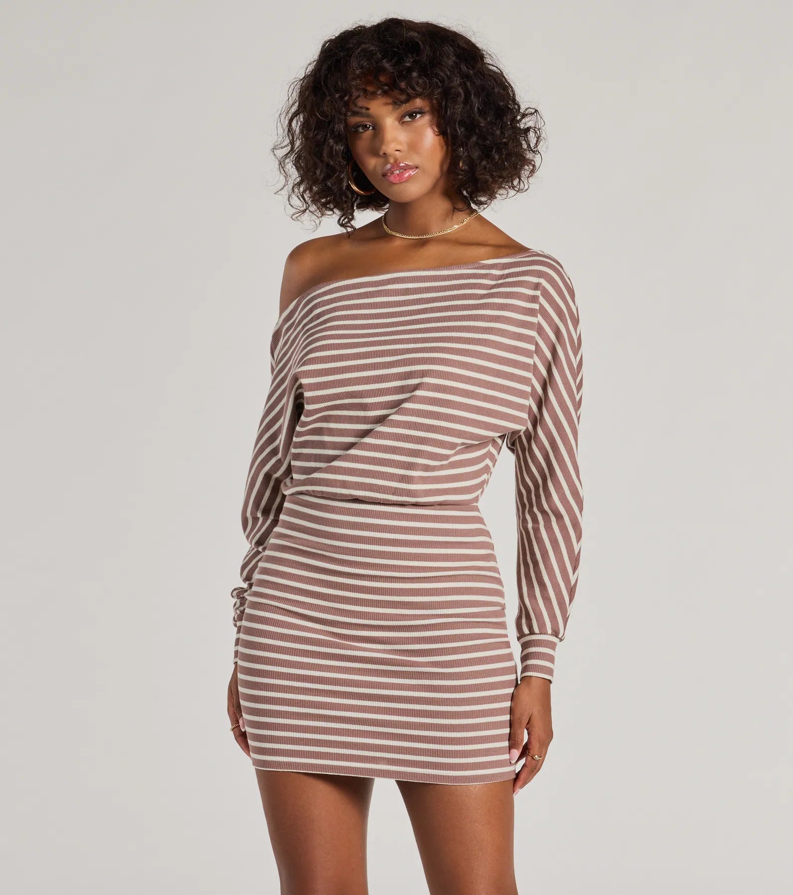 Stay stylish in this trendy off-the-shoulder mini dress showcasing a classic striped pattern and a form-hugging fit. Pair with knee-high boots.