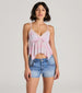Your attraction will be undeniable in this scenic print mesh crop top perfect for adding a romantic look! It features a flirty V-neckline adorned with delicate lace trim and ribbon. spaghetti straps. a babydoll silhouette that flatters. and a flowy cropped hem. Complete the look in a denim skirt and sandals for any casual plans!