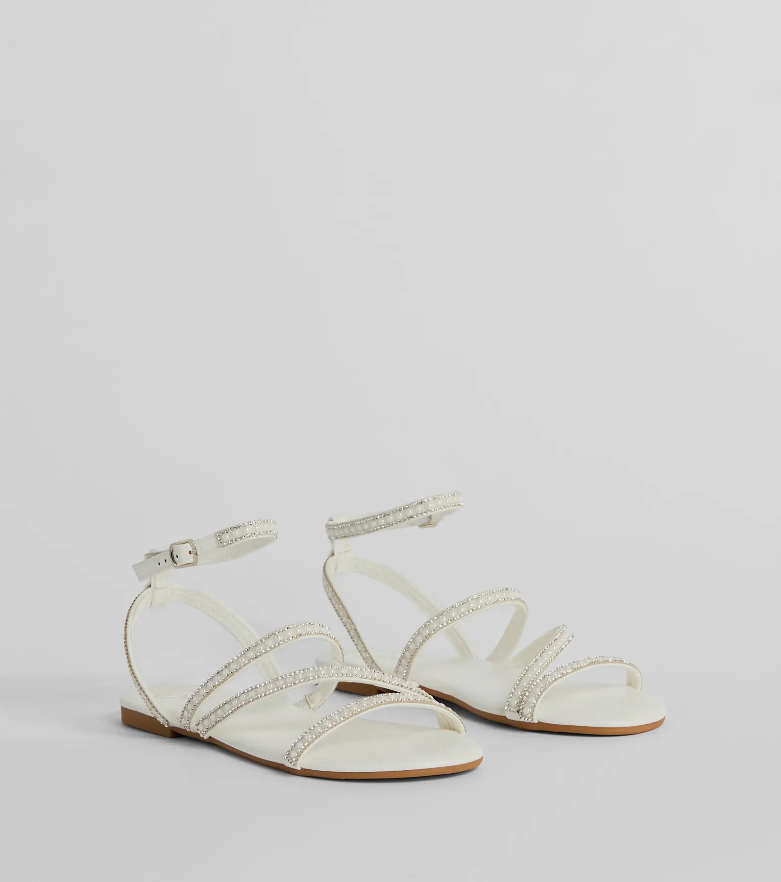 Sparkling crystal rhinestones and faux pearl embellishments add a stunning artistry to these flat sandals perfect for brides or any dressy event! Featuring a round toe and strappy design. with an adjustable ankle strap for the perfect fit. The lightly cushioned footbed and flat sole provide all-day comfort to these faux leather sandals. Complete the look with a hair accessory for a chic finish!