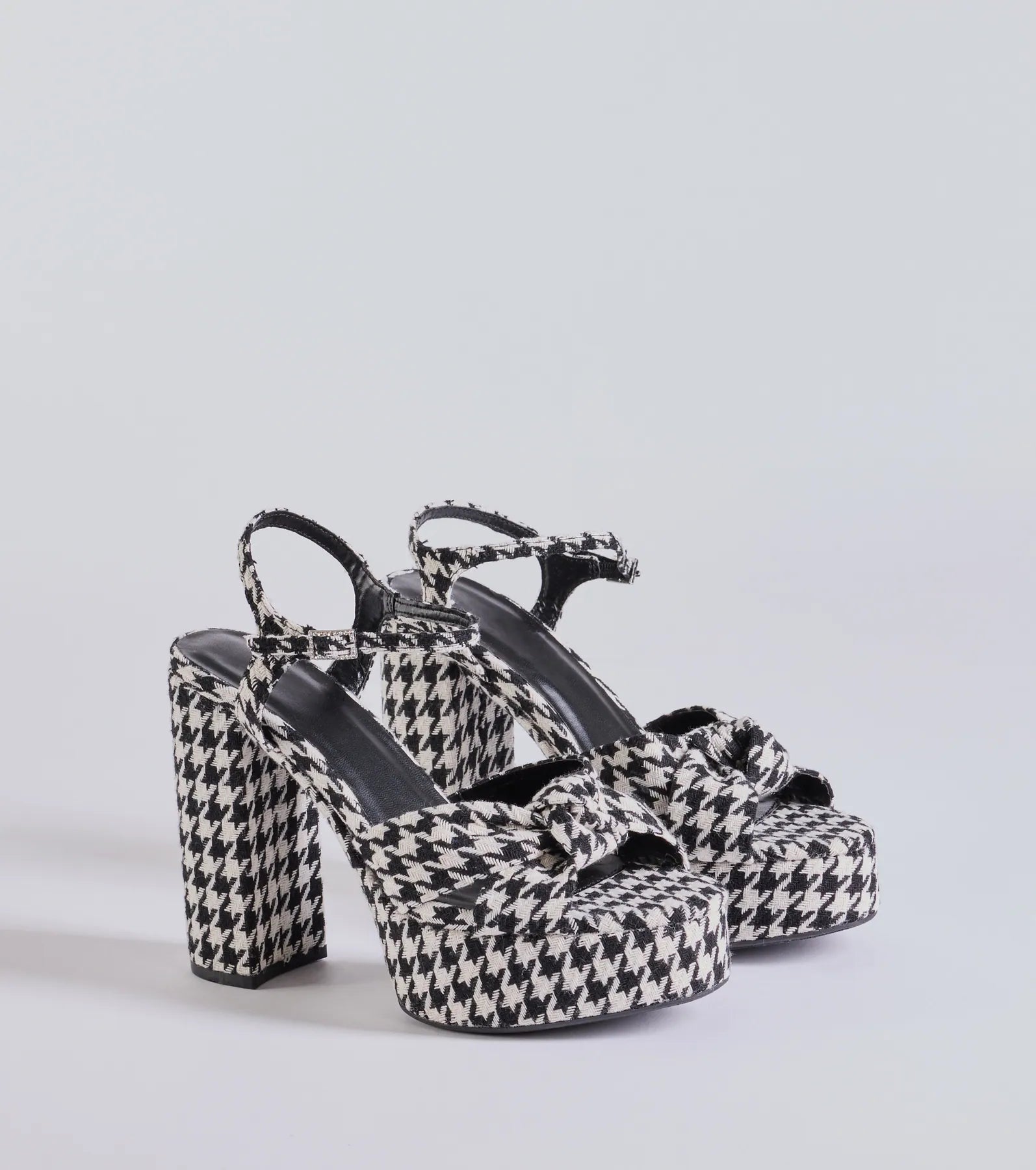 Stun like a style icon in platform heels that feature a trendy houndstooth print. an almond toe with a knot accent. an adjustable ankle strap with buckle closure. a platform sole. and a sturdy block heel. Complete with a pleated skirt and cardigan.