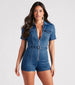 Keep your style in check and looking fresh in this denim utility romper perfect for weekend road trips or exploring downtown! It features short sleeves. a collar neckline. front zipper closure. flap pockets. a belted waist with buckle closure. a short-length hem. and a form-hugging fit. Complete the look in trendy sandals.