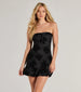 Bring the stylish flair in this lined mesh mini dress accented with a floral velvet burnout pattern for a pretty look. It features a strapless straight-across neckline with a front bow trim. an adorable short ruffled hem. and a flirty A-line silhouette.