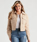 Keep stylish through the chill in this quilted puffer jacket featuring long sleeves with buttoned cuffs. a collar neckline. snap-button down front closures. flap pockets. and a cropped hem. The jacket is designed with thin insulation to help keep you comfortable and protected from the elements. Style over a long sleeve top with woven joggers.