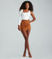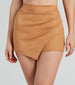 Show off stylish perfection in this chic faux wrap skort! It features a high-rise waist. a back zipper closure. a faux wrap-front design with ruched detailing. and fitted shorts. The smooth faux suede fabric has a moderate stretch. Complete your look for weekend plans with a fitted bodysuit and clear mules.