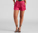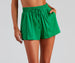 Keep it stylishly sleek with a pair of shorts that bring the luxe. The shorts feature a high-rise elastic waist. drawstring. hidden side pockets. and a cheeky bottom. The shorts are composed of a satin fabric that offers a relaxed fit with minimal stretch. Complete the look with the matching long sleeve top.