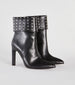 Stylishly studded. these faux leather stiletto booties are sleek perfection. They feature a dramatic pointed toe. a fold-over design at the ankle with round studded details. an inner zipper closure. and a thin stiletto heel. Pair with silver hoops and a chain necklace.