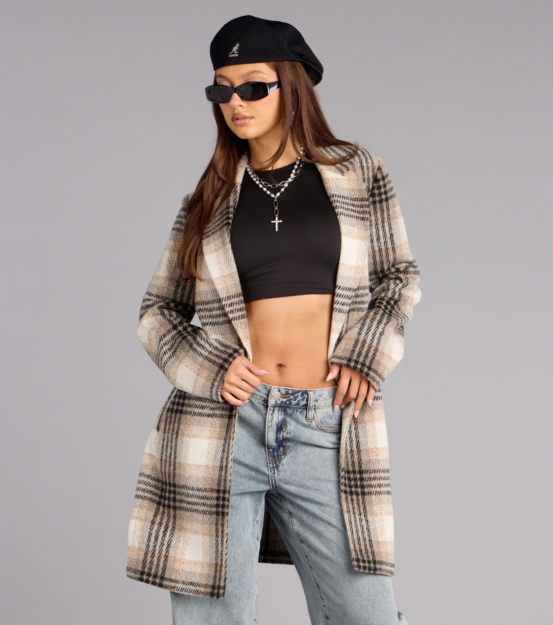 Layer this plaid trench coat for an effortless style day or night. With a classic collar and soft faux wool. this coat will be your new favorite staple all season!