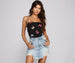 Show off your flirty style with this adorable sleeveless bodysuit. It features a square neckline. bungee spaghetti straps. a cute and colorful butterfly print. and a form-hugging fit. Pair this bodysuit with a denim mini skirt and sneakers.