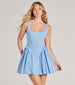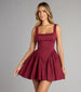 Channel your sugar and spice in this sleeveless skater dress at the school dance or dressy date! Â Designed with a square neckline and shoulder straps for a flattering fit. this dress also boasts a low-cut back with a tie closure for an added touch of flirtiness. The skater silhouette and ruffled sides create a playful and feminine look. while the short-length hem offers a modern style. Complete the look with jewelry and a clutch!