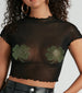 Bring the sultry charm in the cutest St. Patrick's Day-themed crop top for parties or pub crawls! The stretchy sheer mesh fabric is accented with two rhinestone-embellished four-leaf clovers in a cheeky placement. The form-hugging top features a crew neckline. short cap sleeves. and a cropped hem for a snatched look. Style with a mini skirt and mules!