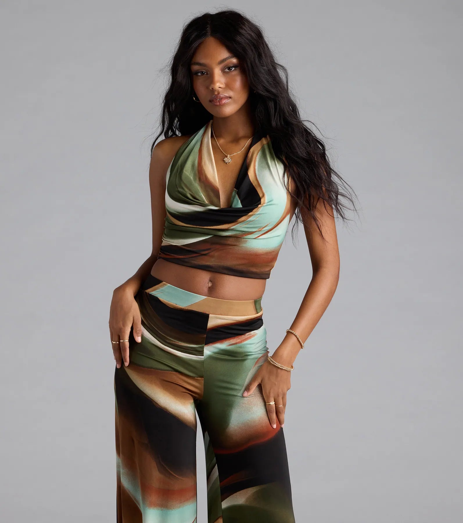 Printed to perfection in a flattering halter silhouette. this crop top boasts a sultry cowl neckline and an open back to show some skin! Pair with the matching pants.