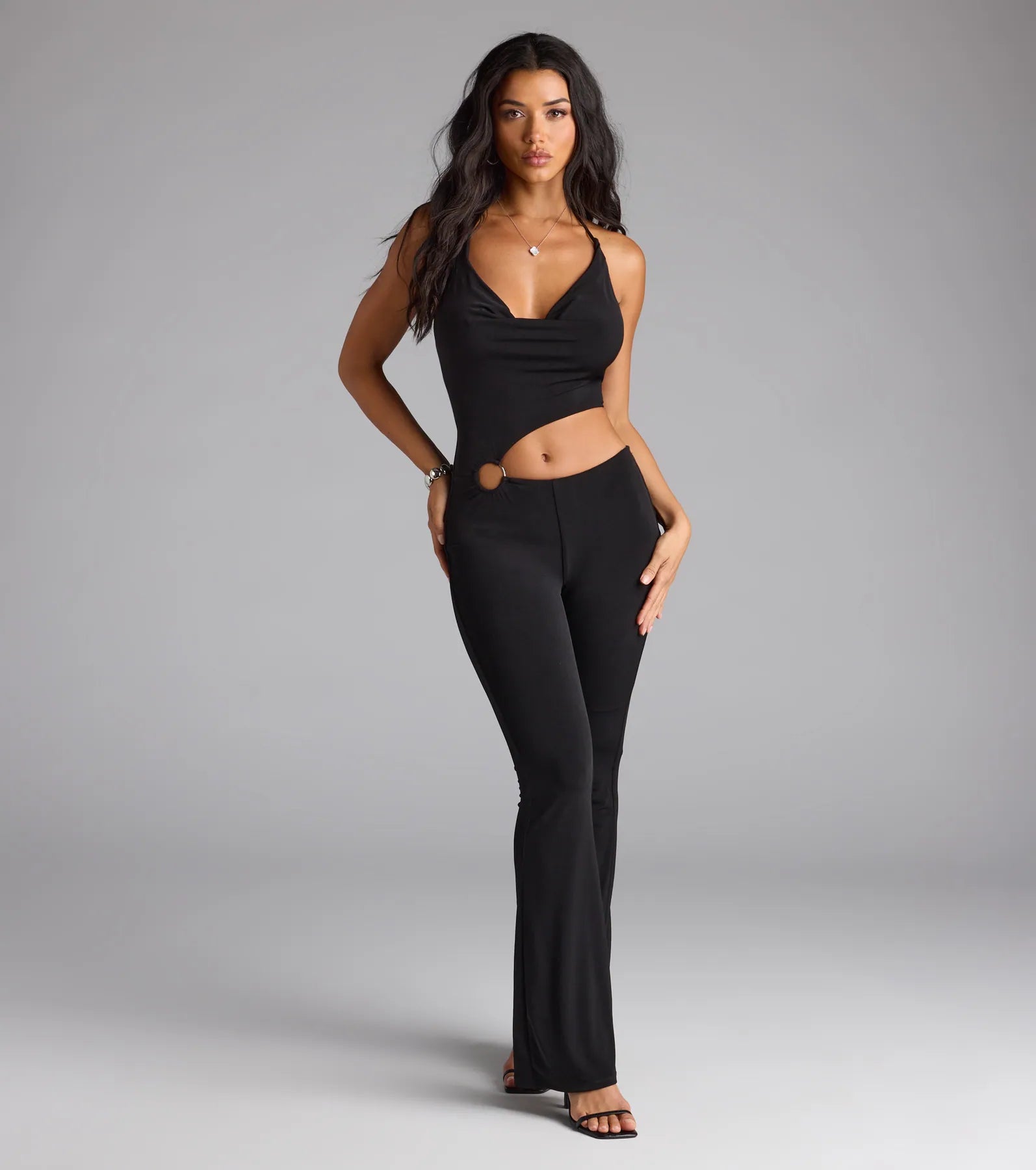 Add a head-turning touch to your night out in this jumpsuit! The cowl halter neckline creates an alluring silhouette. while the front cutout bodice with hoop insert adds chic.