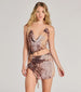 Keep your club 'fits oh-so-sultry with this abstract print mini dress that will capture all the attention. The airy mesh fabric showcases an abstract multi-print pattern for that trendy girl vibe and includes a knit lining for coverage. The mini-length dress features a sleeveless cowl neckline. tie-back halter spaghetti straps with front O-ring accents leading to an open back. and an alluring asymmetric waist cutout with a larger O-ring accent. The front ruching will accentuate your curves. leading to a front slit with a flirty ruffled trim. The bodycon silhouette will flaunt your stunning figure. Style this going-out dress with hoop earrings and stiletto heels.