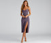 Slip into this sophisticated crepe midi dress for a chic date night! It features spaghetti straps. a V-neckline. and a midi-length hem with a front slit. Style with lucite heels and sparkly earrings.