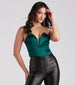 Show off a sultry style in this sleek satin bodysuit! It features a strapless plunging V-neckline with a wired design for added structure. a knit thong bottom. and a form-hugging fit. The smooth satin-knit fabric offers a moderate stretch. Pair with faux leather pants and clear heels.