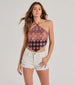 Sunny days and sultry nights call for this boho satin crop top! The halter neckline and spaghetti strap tie provide a secure and comfortable fit. while the open back and lower tie closure add a touch of daring. With its pointed crop hem. this top is perfect for pairing with your favorite high-waisted bottoms.
