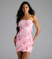 Show up and show off your beauty in this floral printed mesh mini dress perf for summer soirees! Featuring a strapless neckline and asymmetric ruffled design. you'll turn heads with your flirty allure.