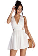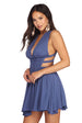 Feel the heat while keeping it cool in this gauzy olive skater dress. Dress features a deep V at front and back. side bar cutouts. an elasticated waist. and an all-over crinkle effect. Dress is made from a rayon fabric with moderate stretch. Dress is semi-sheer and unlined.