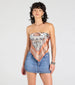 Let the sun kiss your shoulders in this cute satin paisley scarf top perfect for festivals or weekend getaways! Featuring a strapless neckline and a tie-back design. style with denim shorts for an effortless look.