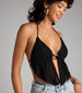 Vacation right in this halter crop top with a sultry open back design and a trendy beaded embellishment. it's perfect for looking cute under the sun!