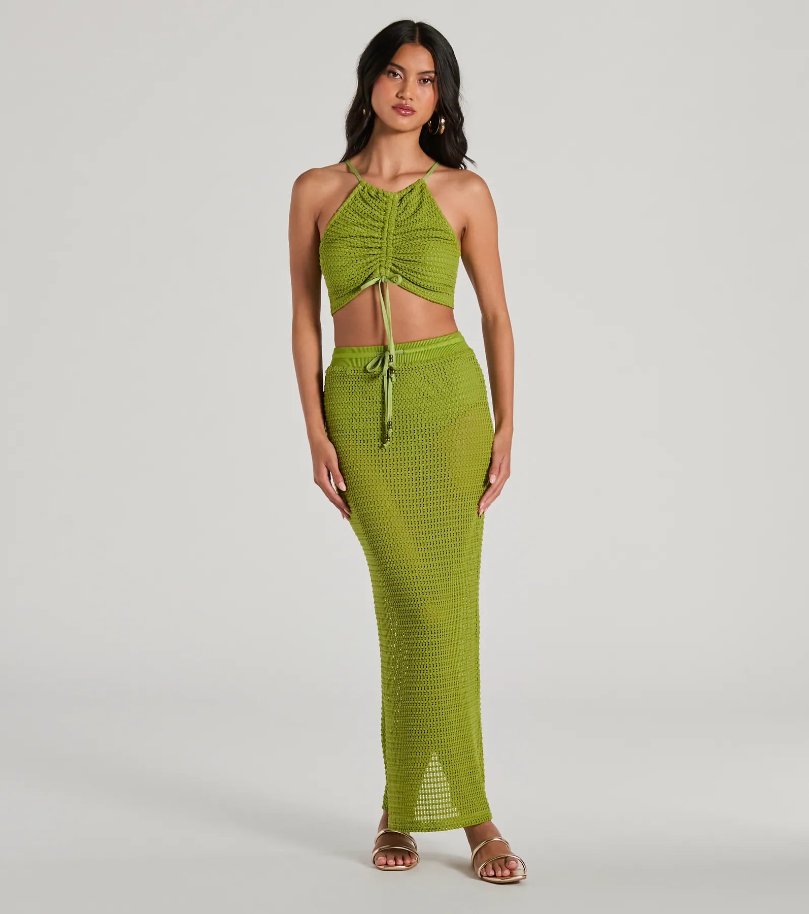Create a sunny chic 'fit with the cutest crochet maxi skirt! Designed with a breezy sheer crochet knit fabric with a built-in panty lining. this skirt was made for summer getaways. It features a high-rise banded waist with a front adjustable drawstring for a customized fit. a high-cut back slit. and a slim-fit silhouette. Complete your look with the matching crop top and a pair of slip-on sandals!