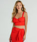 This airy woven crop top will bring the sunny vibes to your weekend plans! Designed with a lightweight woven fabric. it features a sweetheart neckline with ruching at the bust. thin tank shoulder straps. an alluring open back with the cutest tie-back bow design. and a cropped hem with a form-hugging fit for a snatched silhouette. Style with the matching midi skirt for a fabulous 'fit.