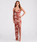 Give off a romantic allure at your sunset dinner date in this form-hugging maxi dress! It features a sleeveless cowl neckline. spaghetti straps. an open back with a cross-back lace-up strappy design. a floor-length hem with a sultry asymmetric high side slit to showcase some leg. ruched detailing. and an all-over tropical palm leaf print. Style with hoop earrings and espadrille wedges.